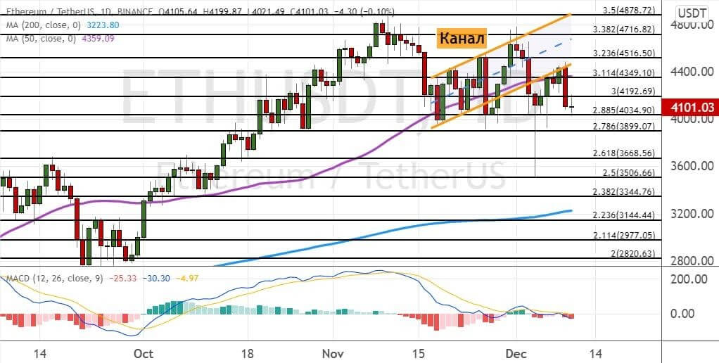 Однако текущая цена эфира находит в зоне «перепроданности» на осцилляторе MACD. Этот сигнал указывает на то, что в перспективе быки могут поднять котировки ETH выше $4 350, где расположена линия 200-периодной SMA. Первыми целями для быков станут уровни $4 520, где проходит нижняя граница модели теханализа «Восходящий канал» (обозначена на графике ниже оранжевым цветом), и $4 720.