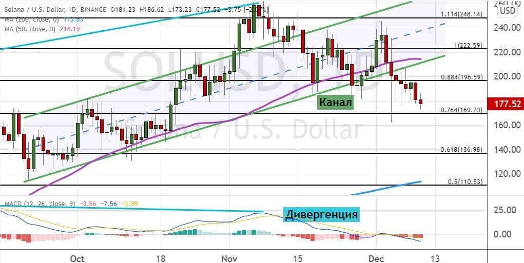 Стоимость SOL продолжает снижаться, а движение котировок альткоина начинает принимать вид модели теханализа «Нисходящий клин» (обозначена на графике ниже оранжевым цветом). При этом сегодня была пробита поддержка на уровне $170, что может привести к более глубокому снижению до $137 и $110.
