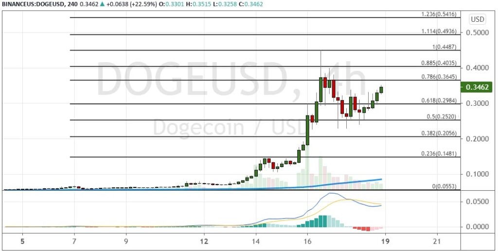 После отскока от поддержек $0.25 и $0.30 для DOGE открылись перспективы для восстановления восходящего движения к первым целям $0.3650 и $0.40. Эти цели были рассчитаны на основе расширений по линиям пропорции Фибоначчи. В среднесрочной перспективе котировки DOGE будут готовы устремиться дальше вверх к $0.45, $0.4940 и $0.54.