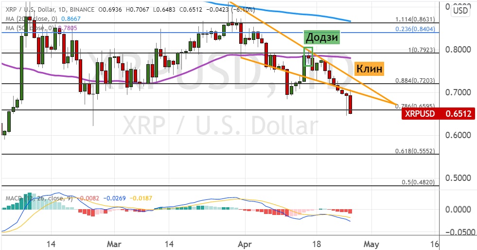 XRP преодолел нижнюю границу модели теханализа «Клин» (на графике ниже обозначена оранжевым цветом), что привело к прорыву уровня поддержки $0.65. Дальше котировки альткоина могут направиться в район первых целей медведей $0.60 и $0.55. В пользу реализации этого сценария торгов указывает сигнал в виде свечной модели теханализа «Додзи» (на графике ниже обозначена зеленым цветом).