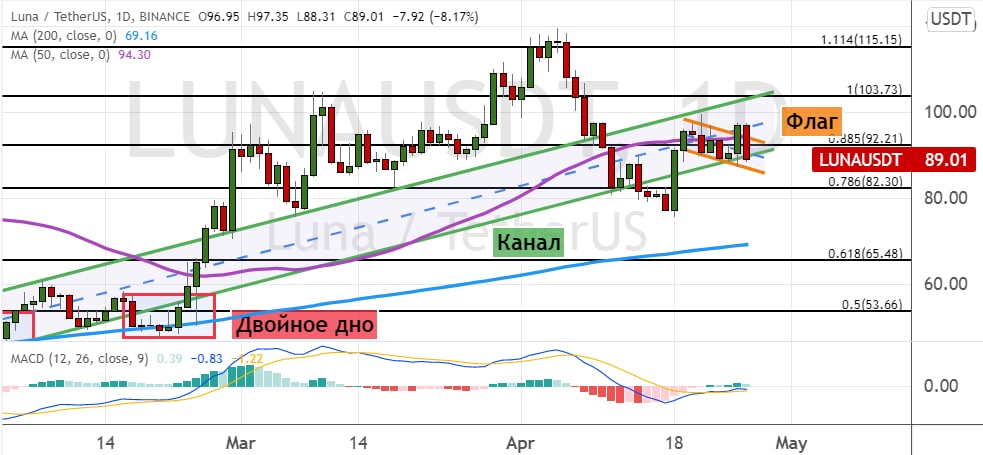 Лидер рынка DeFi криптовалюта LUNA торгуется ниже уровня поддержки $92. Также котировки пробили границы моделей теханализа «Канал» (обозначены на графике ниже линиями зеленого цвета) и «Флаг» (обозначены на графике ниже линиями оранжевого цвета).