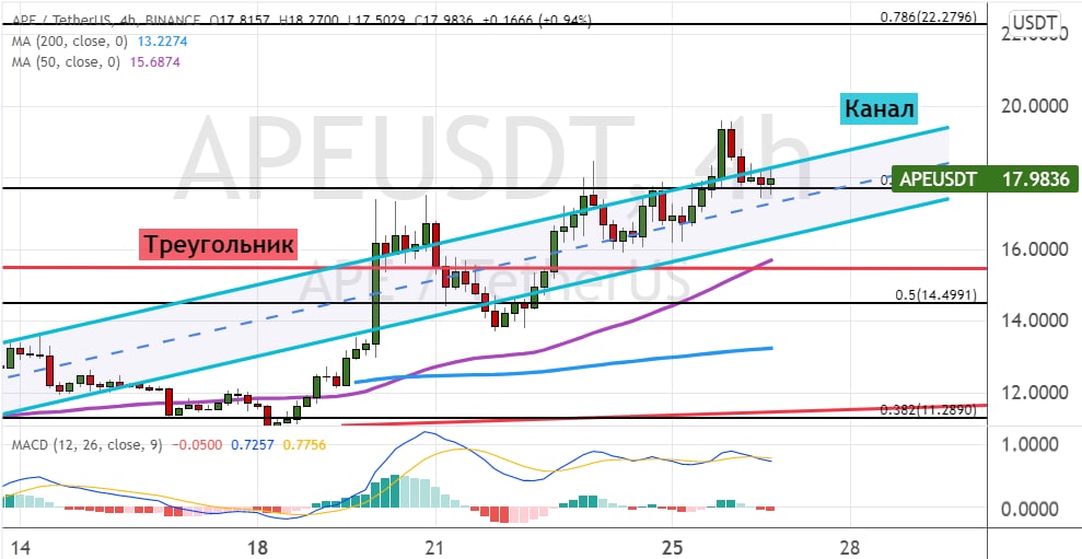 Однако если котировки APE опустятся ниже $16, это станет сигналом о восстановлении коррекционной динамики. В районе $16 также проходят линия 50-периодной SMA и верхняя граница модели теханализа «Треугольник» (отмечена линиями красного цвета). Более серьезное снижение откроет путь для движения цены токена к уровням поддержки $14.50 и $13. В районе $13 также проходит линия 200-периодной SMA.