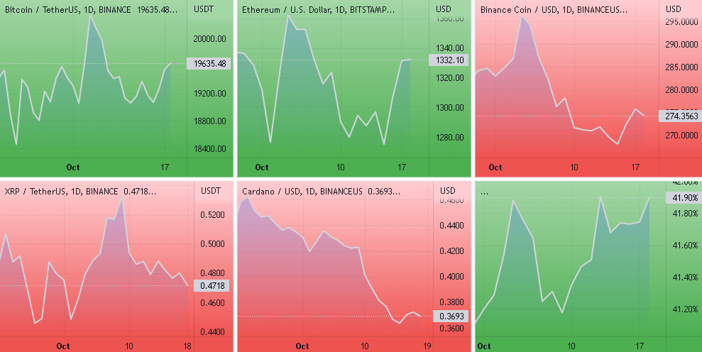 Динамика котировок BTC, ETH, BNB, ADA, XRP (дневной таймфрейм) и график доминации биткоина. Источник
