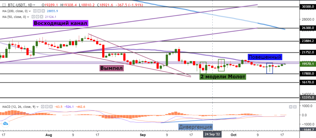 Развитие восходящей динамики позволит быкам в случае закрепления выше сопротивлений $20 000 и $21 000 продолжить развитие краткосрочного восходящего тренда. В этом случае стоимость биткоина продолжит движение до первых целей на уровнях $21 800, $23 800, $25 000 и $26 300. В пользу реализации этого прогноза указывают следующие сигналы теханализа: прорыв верхних границ модели «Вымпел», модель «Повешенный» (обозначена синим цветом) и две модели «Молот» (обозначены зеленым цветом). Также в пользу бычьей динамики указывает сохраняющая актуальность бычья дивергенция между ценой на графике и осцилляторе MACD.