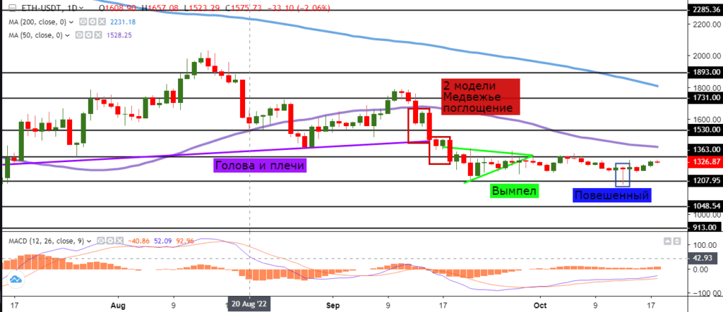 Падение стоимости актива ниже уровня текущей поддержки станет сигналом о восстановлении медвежьей динамики. В таком случае котировки ETH опустятся до первых целей на уровнях $1 200 и $1 100. Более глубокая коррекция направит ETH к уровням $1 050 и $910. В пользу развития этого сценария торгов указывает сохраняющая актуальность модель теханализа «Голова и плечи» (отмечена фиолетовым цветом), а также две модели «Медвежье поглощение» (обозначены темно-розовым цветом) и преодоление нижней границы модели «Вымпел».