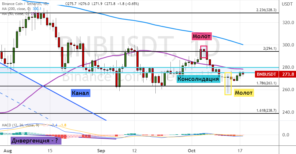 Закрытие дневных свечей выше границ консолидаций $275–$280 и $295–$300, чуть ниже которых проходит линия 50-дневной SMA, приведет к восстановлению бычьей динамики. Она направит котировки альткоина к первой цели, расположенной в районе кластера $320–$330, ниже которого также расположилась линия 200-дневной SMA. Сохранение восходящего тренда позволит BNB продолжить рост до уровней $340, $350 и $366. В пользу реализации этого прогноза указывают сигналы в виде пробития верхней границы модели «Нисходящий канал» (обозначена синим цветом) и дивергенция между ценой на графике и осцилляторе MACD. Также в пользу бычьей динамики может указывать сигнал в виде формирования модели «Молот» (обозначена желтым цветом).