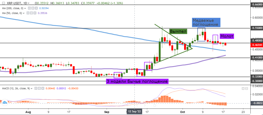 Текущие торги XRP проходят чуть выше уровня поддержки на $0.45 и под сопротивлением $0.48.