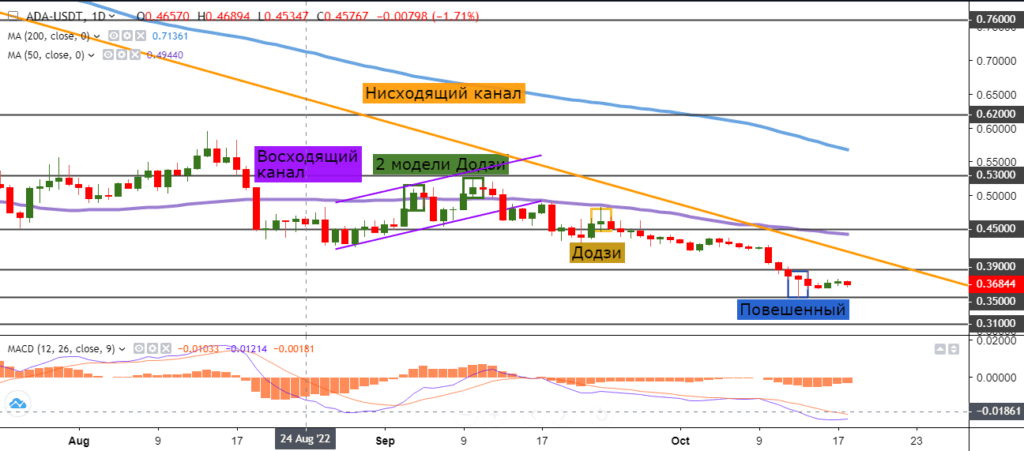 Однако если котировкам ADA удастся закрепиться выше сопротивления в виде кластера $0.48–$0.5, где также проходит линия 50-дневной SMA, то в рамках краткосрочного восходящего тренда альткоин достигнет первой цели, расположенной в районе границ консолидации $0.53–$0.55. В районе этой консолидации также проходит верхняя граница модели теханализа «Нисходящий канал». В среднесрочной перспективе сохранение восходящего тренда приведет к росту стоимости ADA до уровней сопротивления $0.60, $0.62 и $0.65. В районе последнего также проходит линия 200-дневной SMA. В пользу реализации этого прогноза указывает сигнал в виде формирования модели «Повешенный» (обозначена синим цветом).