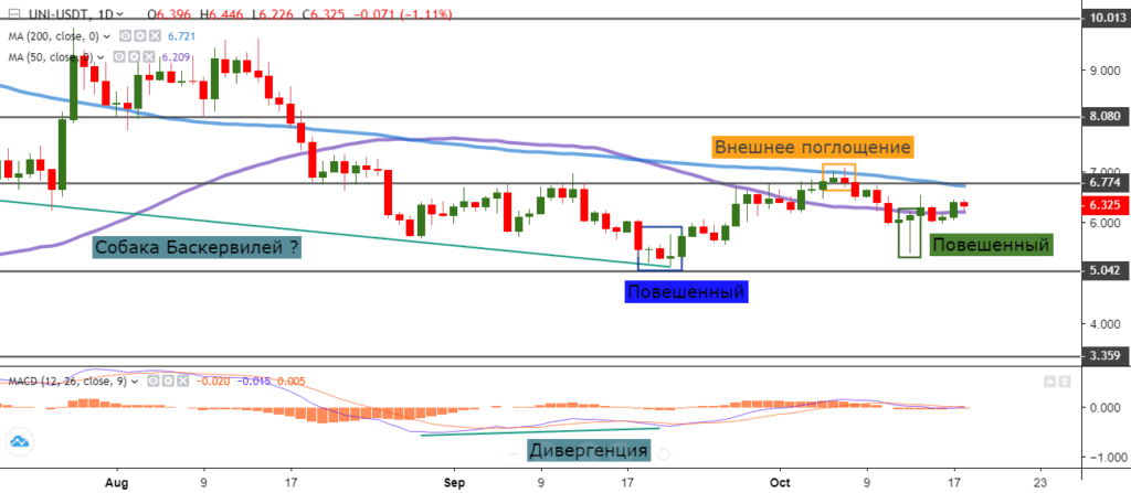 Однако преодоление уровня $7, где проходит линия 200-дневной SMA, станет сигналом для развития движения на снижение. Целями для быков станут уровни $8 и $10. Сохранение бычьего тренда позволит альткоину подняться до уровней $12.50 и $15. В пользу развития этого сценария торгов указывает бычья дивергенция между ценой на графике и осцилляторе MACD. Также в пользу продолжения роста указывают сигналы в виде вероятно формирующихся моделей «Собака Баскервилей» (обозначена серым цветом) и двух моделей «Повешенный» (обозначены зеленым и синим цветом).