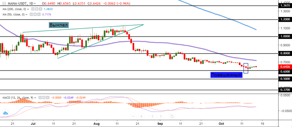 Однако если MANA закрепится выше сопротивления на уровне $0.7, где также расположена линия 50-дневной SMA, это станет сигналом о восстановлении краткосрочной восходящей динамики. В таком случае бычий тренд позволит альткоину подняться до первой цели в виде уровней 0.8, $1, $1.1, где также расположена линия 200-дневной SMA. В пользу развития этого сценария торгов указывает сигнал теханализа в виде модели «Повешенный»
