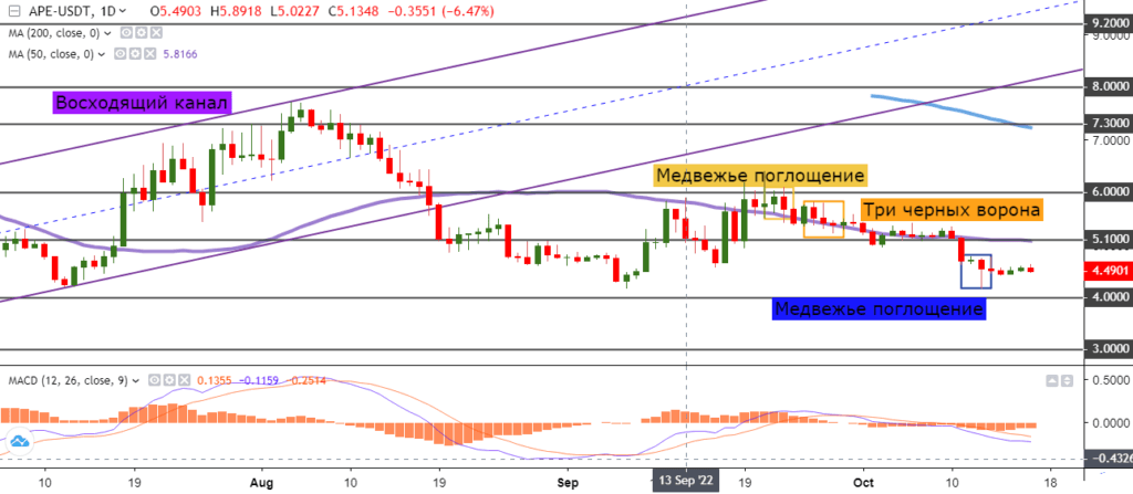 В сегменте NFT одним из лидеров остается токен APE, стоимость которого консолидируется ниже уровня сопротивления $5.1, где также проходит линия 50-дневной SMA.