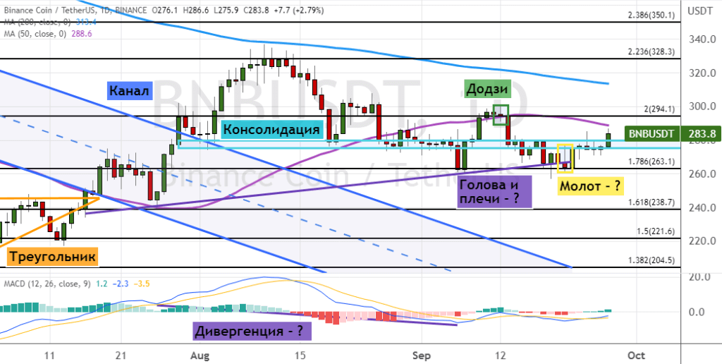Закрытие дневных свечей выше текущего сопротивления приведет к восстановлению бычьей динамики. Она направит котировки альткоина к первой цели, расположенной в районе кластера $320–$330, где также проходит линия 200-дневной SMA. Сохранение восходящего тренда позволит BNB продолжить рост до уровней $340, $350 и $366. В пользу реализации этого прогноза указывают сигналы в виде пробития верхних границ моделей «Нисходящий канал» (обозначена синим цветом) и «Треугольник», а также дивергенция между ценой на графике и осцилляторе MACD. Также в пользу бычьей динамики указывает вероятное формирование модели «Молот» (обозначена желтым цветом).