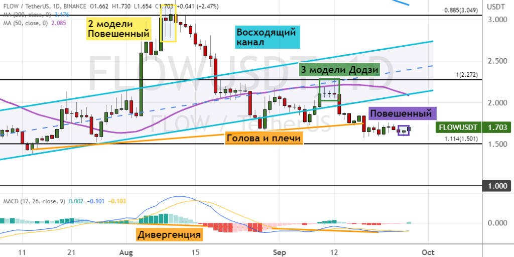 Но в случае падения котировок ниже $1.6 медвежья динамика направит альткоин к поддержке $1.5. Более глубокая коррекция приведет к обвалу FLOW ниже границ консолидации $1.2–$1.5 — до уровня $1. В пользу развития краткосрочной нисходящей динамики указывают две модели теханализа «Повешенный» (обозначены оранжевым цветом). Также в пользу снижения могут указывать три вероятно формирующиеся модели «Додзи» (обозначены зеленым цветом), модель «Флаг (обозначена синим цветом) и преодоление нижней границы «Восходящего канала». Также сохраняет актуальность сигнал в виде модели «Голова и плечи» (обозначена оранжевым цветом).