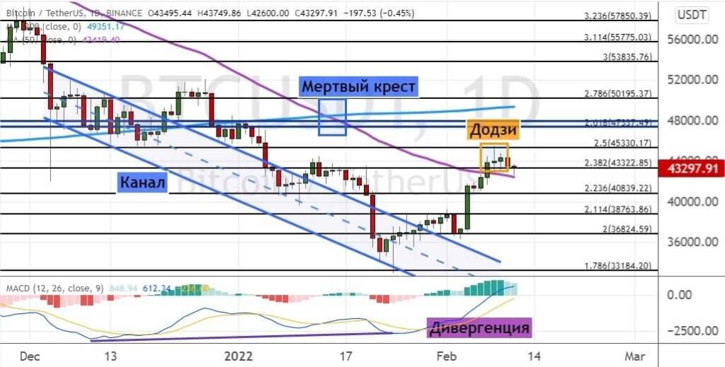 После того как котировки BTC достигли важного уровня сопротивления $45 300, на графике актива сформировались свечные комбинации «Додзи» (обозначены на графике ниже оранжевым цветом). Это стало сигналом о начале снижения стоимости к поддержкам $43 300 и $42 800, где проходит линия 50-дневной простой скользящей средней (SMA).