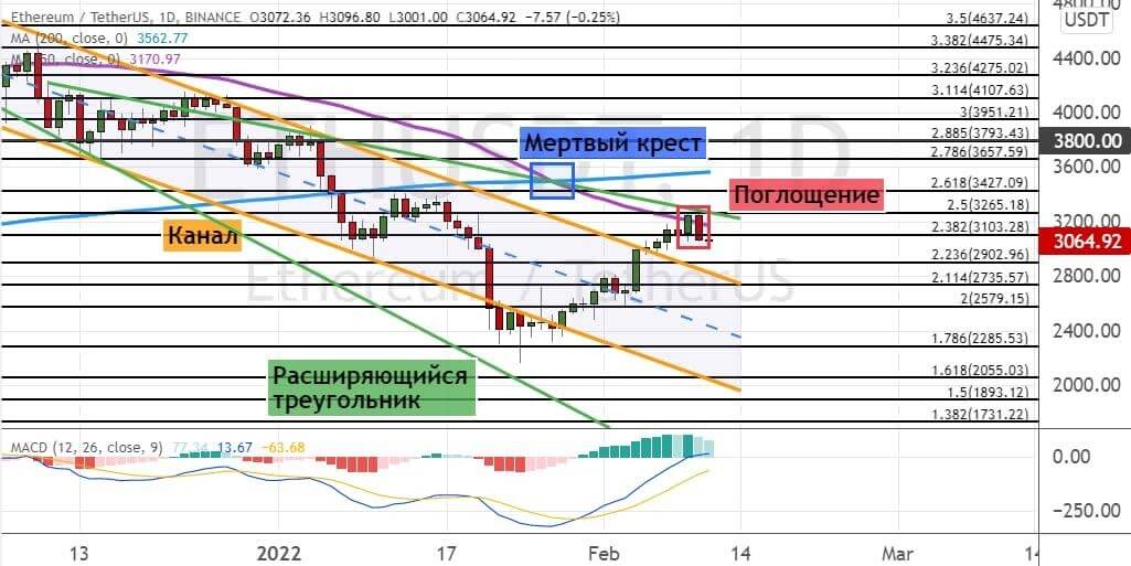 Но если быкам удастся подняться выше сопротивления $3 260, где также расположена верхняя граница модели теханализа «Расширяющийся треугольник» (на графике ниже ее границы отмечены линиями зеленого цвета), то они могут направить котировки ETH к первым целям $3 430 и $3 600, где также проходит 200-дневная SMA.