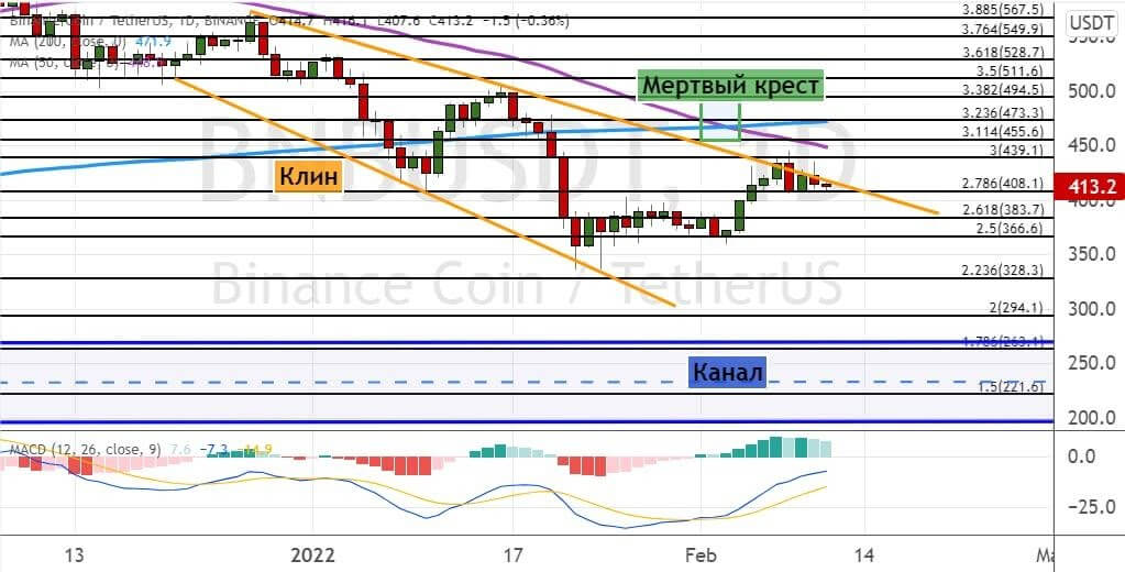 Однако не стоит сбрасывать со счетов возможность коррекции котировок актива ниже $400. В таком случае медведи смогут продавить стоимость альткоина до уровней $380 и $365. В пользу этого варианта проведения торгов указывает сохранение на графике BNB модели теханализа «Мертвый крест». Более глубокое падение направит альткоин к уровням $330 и $300, где расположены границы «Канала» (на графике ниже модель обозначена линиями синего цвета).