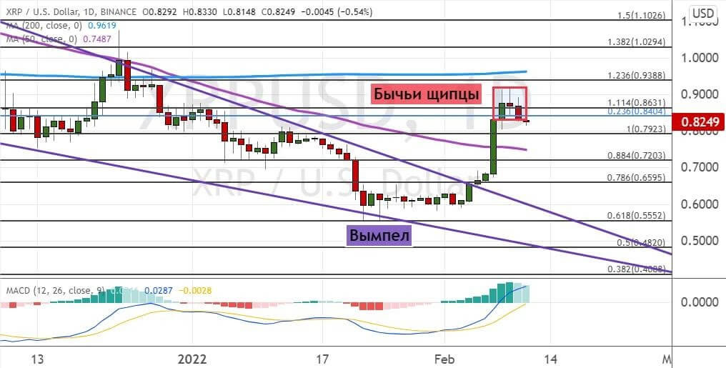 XRP не смог закрепиться выше границ консолидации $0.84–$0.86, что привело к формированию свечной комбинации «Бычьи щипцы» (на графике ниже ее границы отмечены линиями бордового цвета).
