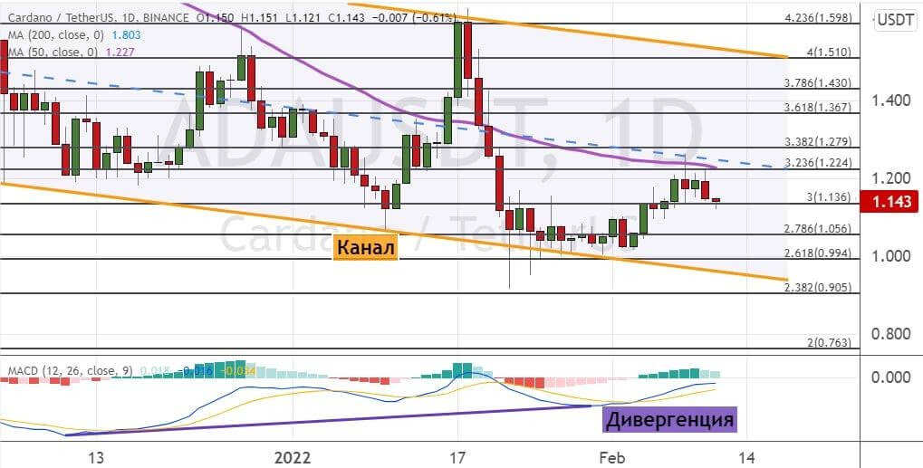 Котировки ADA также не смогли преодолеть границы кластера $1.22–$1.28, где расположены медиана модели теханализа «Нисходящий канал» (обозначена на графике ниже линиями оранжевого цвета) и линия 50-дневной SMA, что привело к снижению до уровня поддержки $1.13.