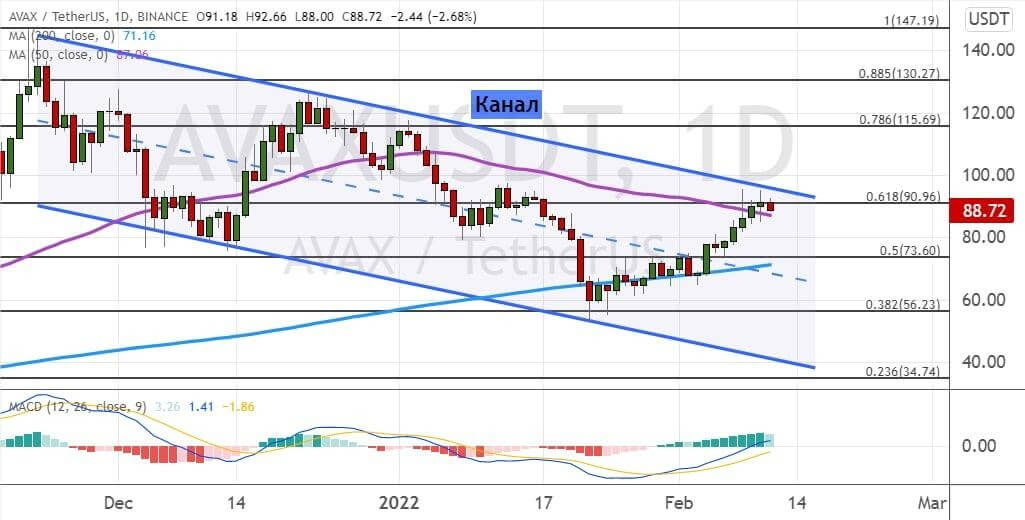С небольшим отрывом на рынке DeFi лидирует криптовалюта AVAX от проекта Avalanche, которая потеснила LUNA (Terra). Котировки AVAX находятся в районе сопротивления $91, где проходят верхняя граница «Нисходящего канала» (обозначена на графике ниже линиями синего цвета) и линия 50-дневной SMA. Попытки быков сохранить восходящий тренд будут встречены сопротивлениями, которые расположены в районах первых целей $100 и $116.