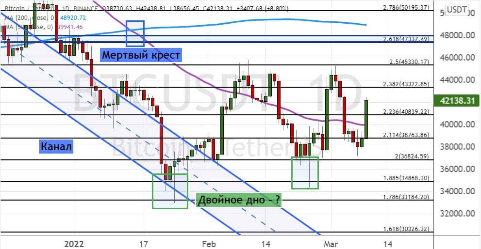 Однако в случае закрытия дневных свечей ниже уровня $36 800 котировки BTC могут опуститься до поддержек $35 000, $33 200 и $30 300. Модель теханализа «Мертвый крест» (обозначена на графике ниже линиями синего цвета), которая сохраняет свою актуальность, указывает на то, что такой сценарий развития торгов нельзя исключать.