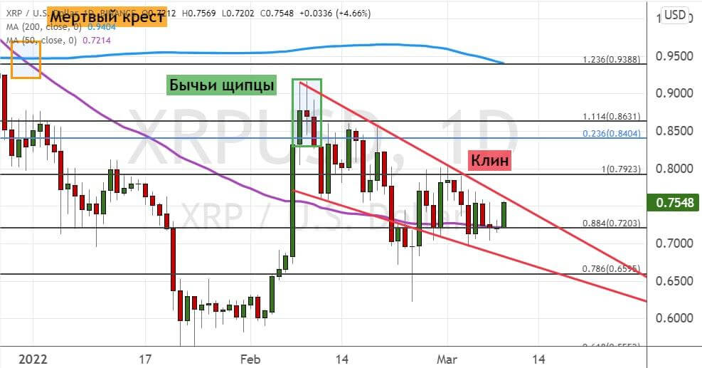 Но в случае падения актива ниже поддержки $0.72 продолжится реализация двух медвежьих моделей теханализа — «Бычьи щипцы» и «Мертвый крест» (обозначена на графике ниже линиями оранжевого цвета). Первой целью в таком случае выступит уровень поддержки $0.66. Более глубокая коррекция направит XRP к уровням $0.6 и $0.55.