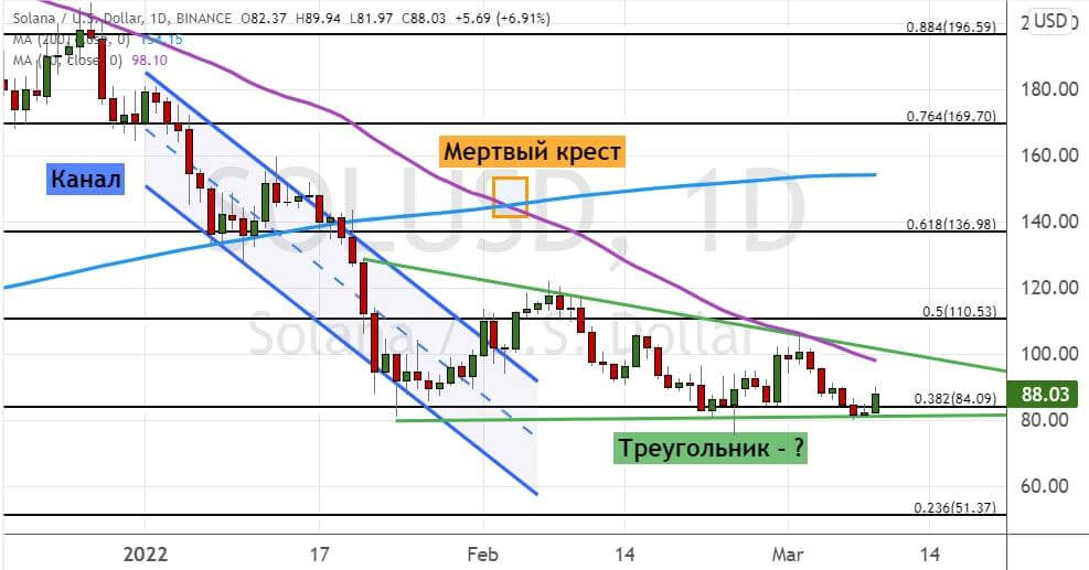 Котировки SOL торгуются чуть выше текущей поддержки $84, где также проходит нижняя граница модели теханализа «Треугольник» (обозначена на графике ниже линиями зеленого цвета). Текущим сопротивлением выступает уровень $100, где также проходит линия 50-дневной SMA.