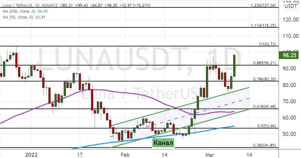 При этом обвал котировок ниже $93 станет сигналом о продолжении снижения до уровней $80 и $70, где также проходит верхняя граница модели теханализа «Канал» (обозначена на графике ниже линиями зеленого цвета). Более глубокая коррекция направит LUNA к уровню $65, где также проходит линия 50-периодной SMA.
