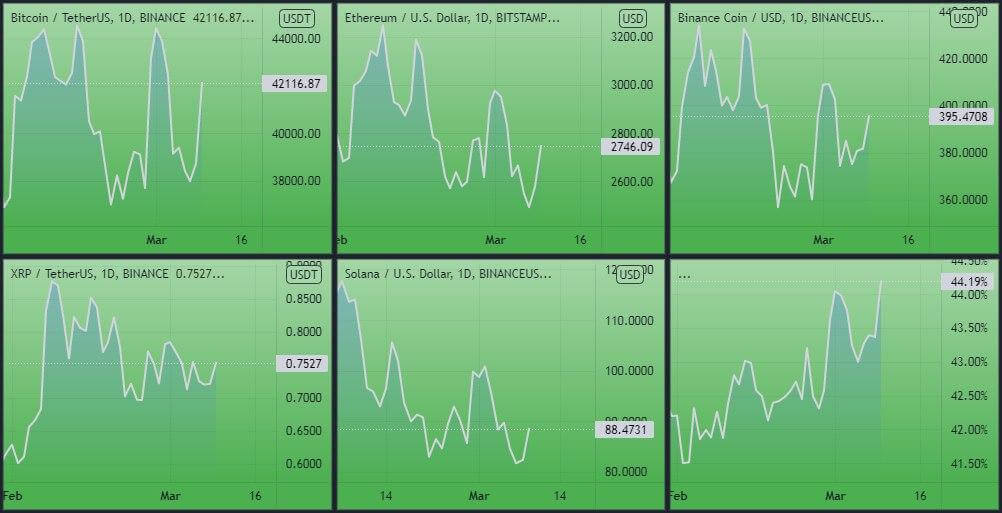 Динамика котировок BTC, ETH, ADA, BNB, XRP (дневной таймфрейм) и график доминации биткоина. Источник