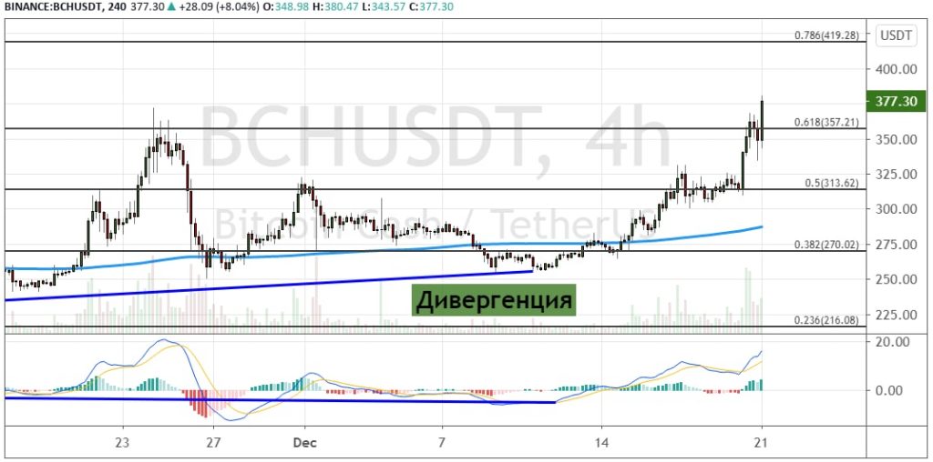 Bitcoin Cash вполне ожидаемо вновь произвел тестирование поддержки на уровне $357.21 (61.8% коррекция по линиям Фибоначчи). В перспективе набор новых позиций быками может отправить актив к следующей среднесрочной цели $375, и далее к уровню $400.