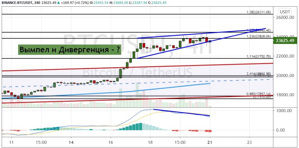 За выходные биткоин достиг первой важной цели в виде границ области сопротивления $23 820 – $24 430. Однако сейчас котировки BTC склонны развивать нисходящую краткосрочную коррекцию. В пользу этой идеи указывает формирующаяся медвежья дивергенция между ценой на графике и MACD. Сигналом для ее развития станет закрепление нескольких четырехчасовых свеч ниже границы фигуры теханализа «Вымпел».