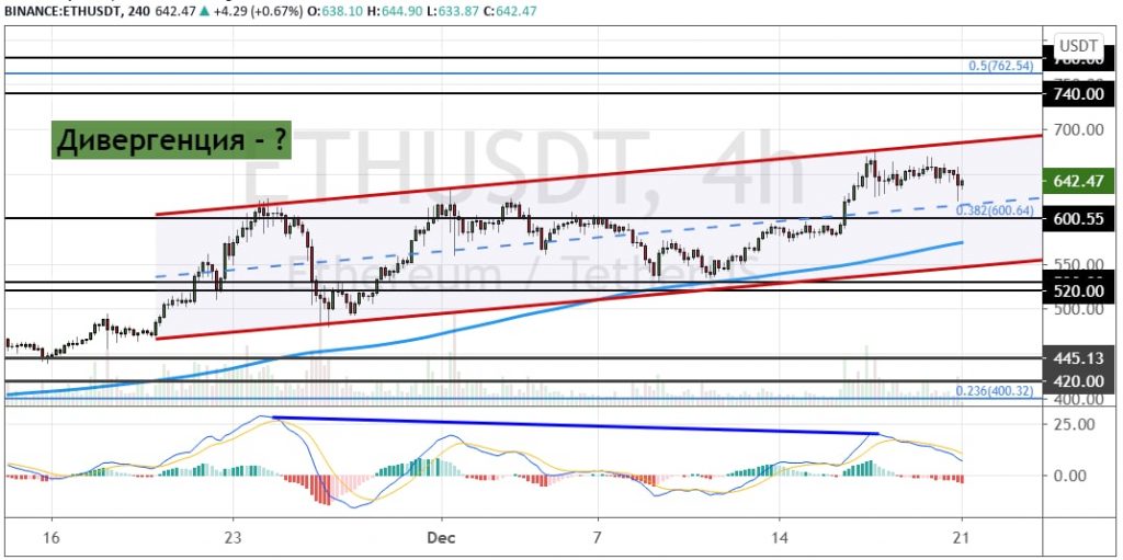 Эфир уверенно достиг первых целей $630 и $660 и района горизонтального уровня $700. Но пока у котировок ETH не получается протестировать эту отметку из-за проходящей чуть ниже верхней границы модели теханализа «Восходящий канал». Вследствие сохраняющейся медвежьей дивергенции между ценой на графике и на осцилляторе MACD возможно развитие коррекции к $600, где проходит 200-дневная простая скользящая средняя (SMA). При условии, что альткоин опустится ниже этого уровня, его стоимость отправится вниз к областям $520 – $550 и $475 – $500 и далее к уровням $445, $420 и $400.