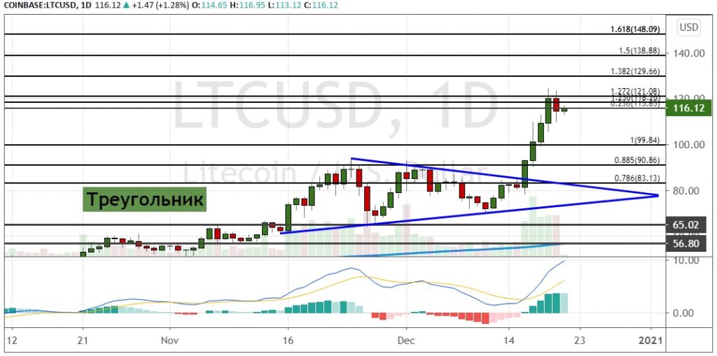 Лайткоин преодолел сопротивление на уровне $83 (78.6% коррекция по уровням Фибоначчи) и $90.80 (88.5% коррекция по уровням Фибоначчи). Это позволило котировкам LTC вначале протестировать уровни $100 и $110, а затем подняться к кластеру $115.85 – $121.