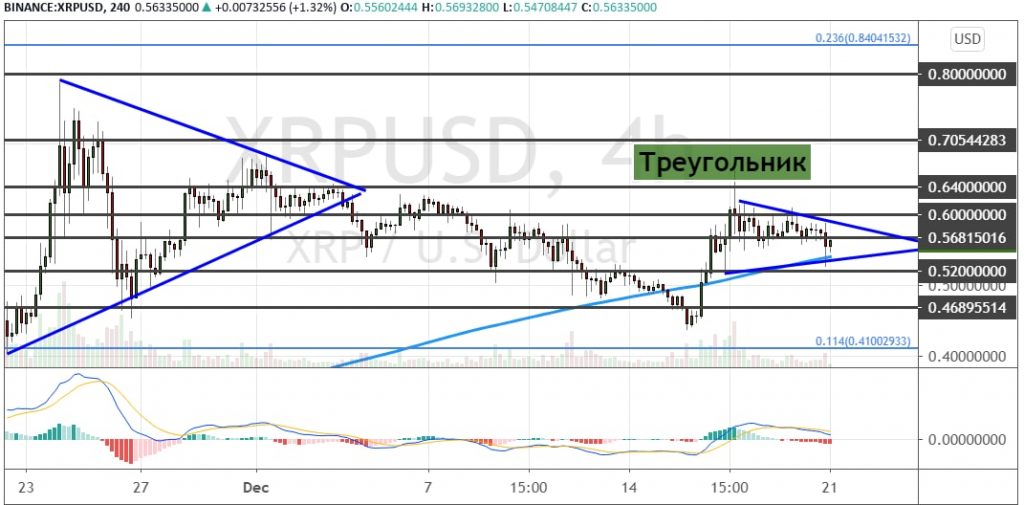 Сегодня рипл развивает высокую волатильность, формируя модель теханализа «Треугольник». Сейчас котировки альткиона заключены между уровнем поддержки $0.52, где проходит 200-дневная SMA, и отметкой $0.5682. При этом сопротивлением выступает уровень $0.60.