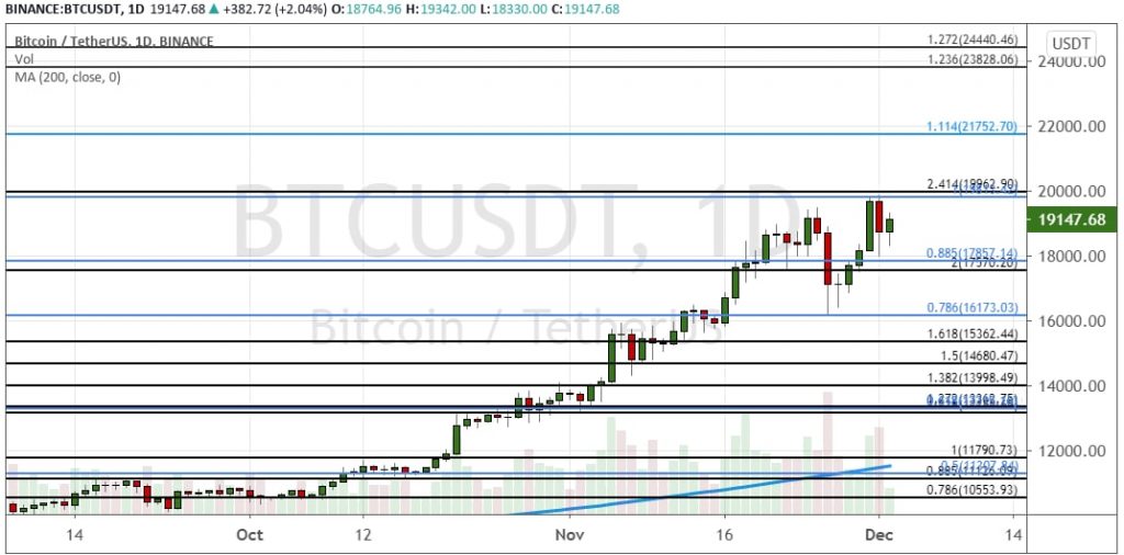 В понедельник биткоин обновил свой исторический максимум на отметке $19 864. В среднесрочной перспективе восходящее движение котировок BTC продолжится, но при условии закрытия дневных свеч выше критически важного уровня $20 000. В предстоящие месяцы целями остаются уровни $22 000 и кластер $23 820 – $24 440.