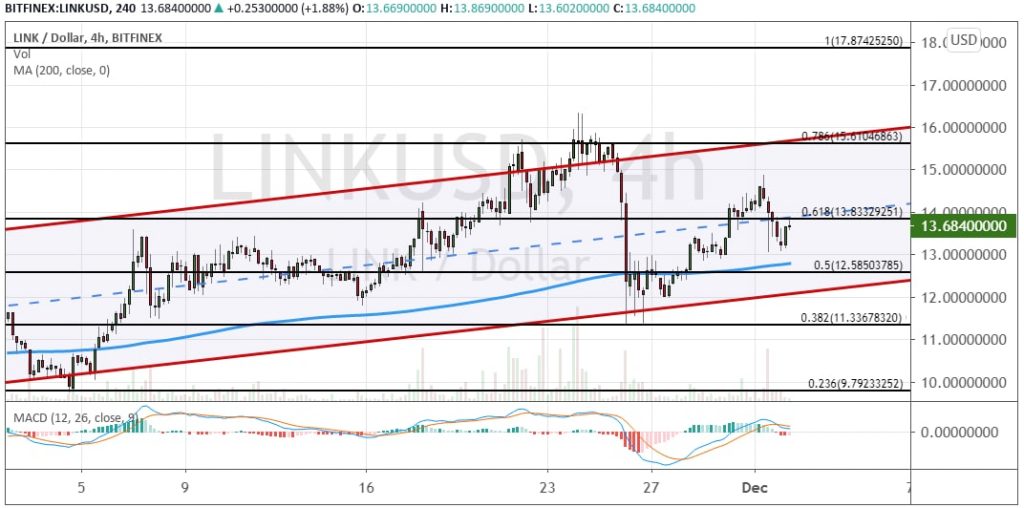 Котировки LINK уверенно преодолели сопротивление $13.83 (6.8% коррекция по уровням Фибоначчи). Это позволило активу подняться до отметки $15, но закрепиться выше ему пока не удалось. В результате стоимость LINK скатилась в район $13.83.