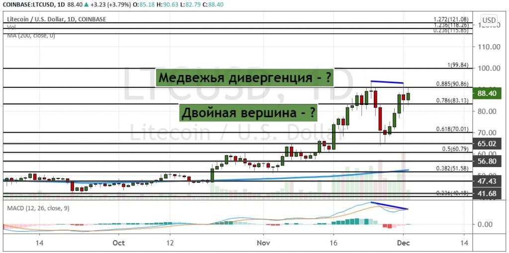 Лайткоин достиг целей на уровнях $83 и $90.80 (78.6% и 88.5% коррекция по уровням Фибоначчи). Уход выше последней приведет к дальнейшему росту к $100 и $110. Сохранение этого импульса позволит котировкам LTC  подняться к $115, $118.26 и $121.