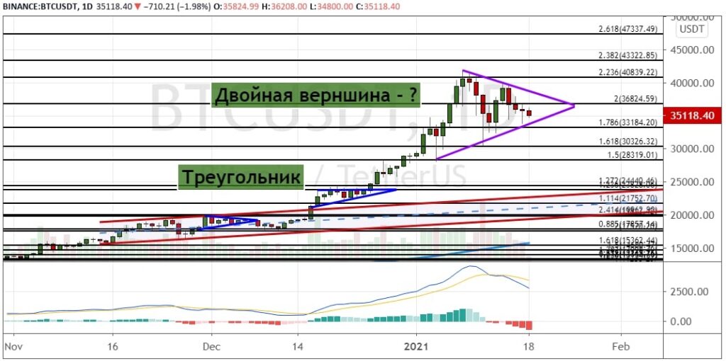 Текущим сопротивлением остается уровень $36 824, а линия поддержки находится на отметке $33 180 (78.6% коррекция по уровням пропорции Фибоначчи). Прорыв нижней границы «Треугольника» приведет к развитию нисходящей коррекции, что подтвердит и реализация формирующейся модели теханализа «Двойная вершина». Уход ниже текущей линии поддержки позволит биткоину протестировать уровень $30 326, где также расположена линия 200-дневной простой скользящей средней (SMA). В краткосрочной перспективе биткоин может устремиться к $28 319 и кластеру $23 820 – $24 440.