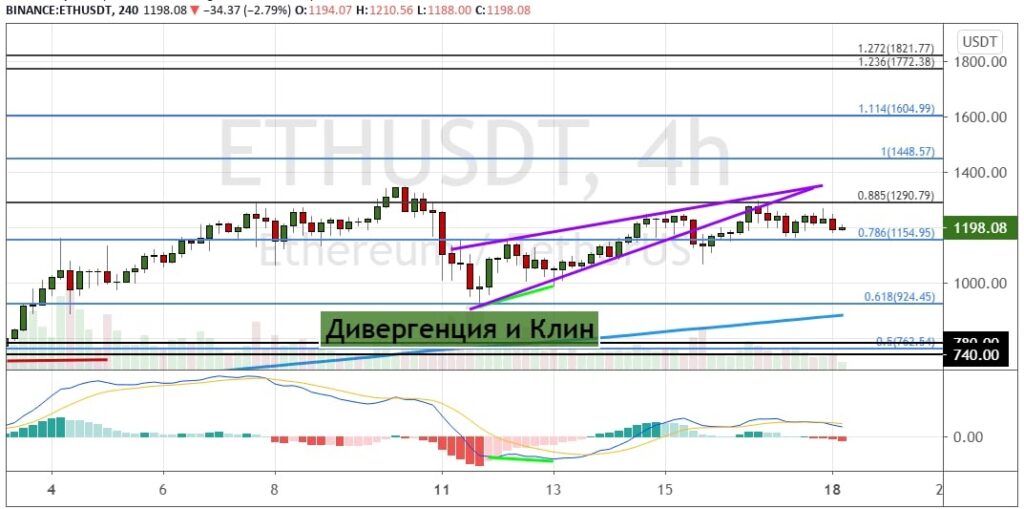 После краткосрочного роста на фоне дивергенции между ценой на графике и осцилляторе MACD котировки эфира оказались зажаты между текущей поддержкой на $1 155 и сопротивлением на $1 290 (78.6% и 88.5% коррекция по уровням пропорции Фибоначчи). В ближайшее время актив пытается преодолеть нижнюю границу модели теханализа «Клин». Если эфир пробьет нижнюю границу этой модели и опустится ниже отметки $1 155, то следующей целью станут уровни $1 000 и $924 (61.8% коррекция по уровням пропорции Фибоначчи), где также проходит линия 200-дневной SMA. Более глубокая коррекция позволит ETH достичь $850 и области $740 – $780.