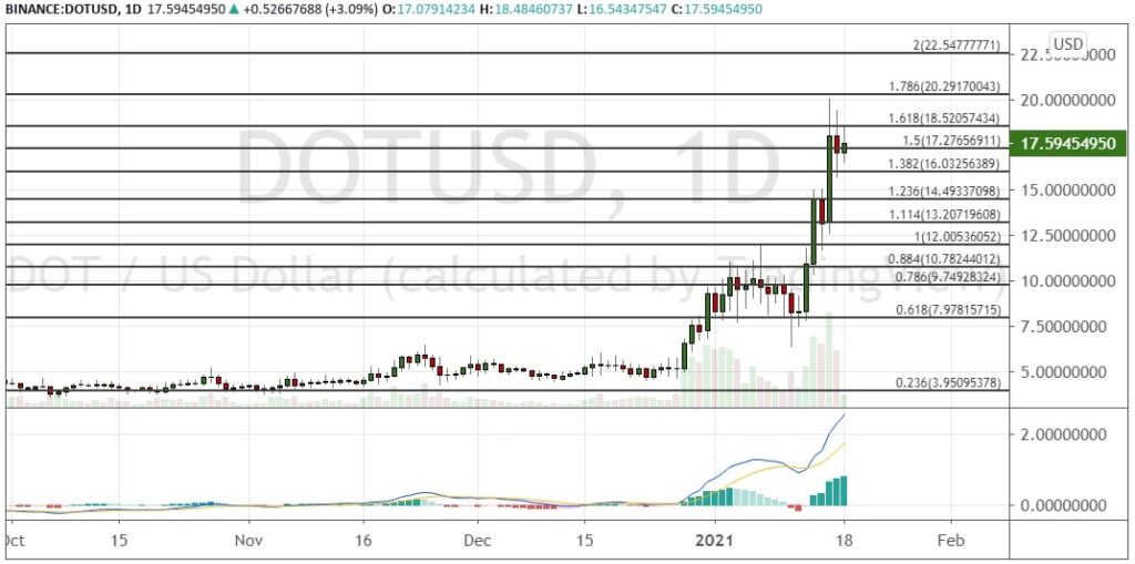 С конца прошлой недели котировки DOT поднялись на 3-е место в рейтинге топовых криптовалют по капитализации. Это случилось после прорыва важного сопротивления $14.50 (23.6% расширение по уровням пропорции Фибоначчи). В результате стоимость актива пробила первую цель в виде области $16 – $16.50, что позволило DOT достичь целей $17.30 и далее $18.50, а затем даже в моменте протестировать $20. Сохранение растущей динамики позволит активу протестировать цели $20.30, $20.50 и $25.