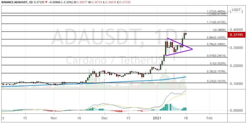 Монета ADA проекта Cardano вытеснила лайткоин с 5-й позиции после уверенного преодоления верхней границы модели теханализа «Треугольник».