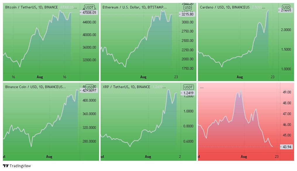 Динамика котировок BTC, ETH, ADA, BNB, XRP (дневной таймфрейм) и график доминации биткоина. Источник