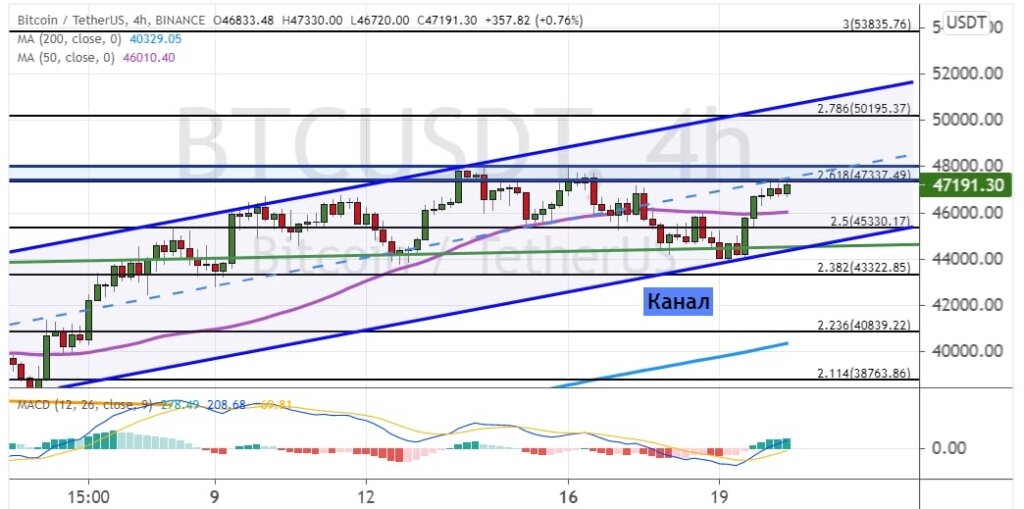 Данный тренд подтвердит рост и закрепление котировок BTC выше ключевого уровня сопротивления $48 000. В таком случае первыми целями выступят уровни $50 200 и $53 800, между которыми расположилась верхняя граница «Восходящего канала». В среднесрочной перспективе BTC имеет все шансы для роста к $55 800, $57 850 и $60 000.