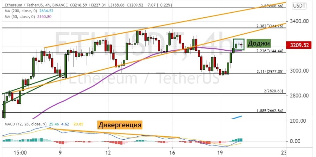 После ретеста поддержки $3 000 эфир стремительно направился вверх. Сейчас котировки ETH пытаются закрепиться выше первой цели $3 150, где проходит линия 50-периодной SMA. Если эфиру это удастся, это станет сигналом о росте его котировок к верхней границе консолидации уровней $3 150–$3 350, где также проходят границы модели теханализа «Клин» (показана оранжевыми линиями на графике ниже).