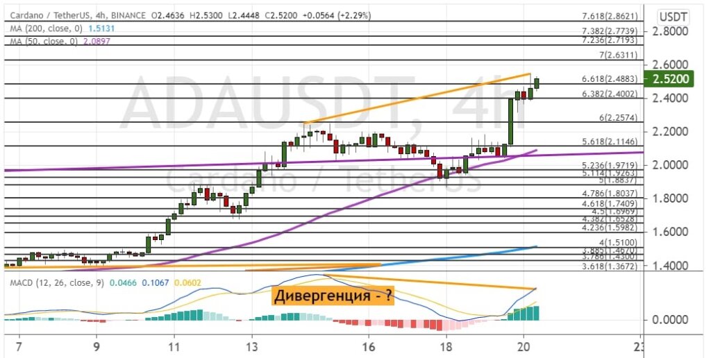 Однако на графике ниже можно отметить наличие дивергенции между ценой и осциллятором MACD. Это указывает на возможное развитие краткосрочной коррекции. Данный сценарий подтвердится, если котировки ADA опустятся ниже кластера $2.25–$2.4. В таком случае ADA направится дальше вниз к $2.1, где проходит линия 200-периодной SMA, и к уровню $1.92.