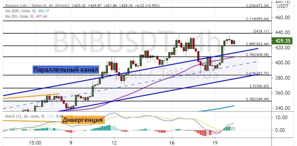На графике ниже можно отметить, что BNB снова попытался выйти за рамки границ модели теханализа «Восходящий параллельный канал». Текущие торги проходят в рамках между уровнями консолидации $420 и $440. Если BNB удастся закрепиться выше $440, это направит котировки альткоина к следующим целям — $455 и $475.
