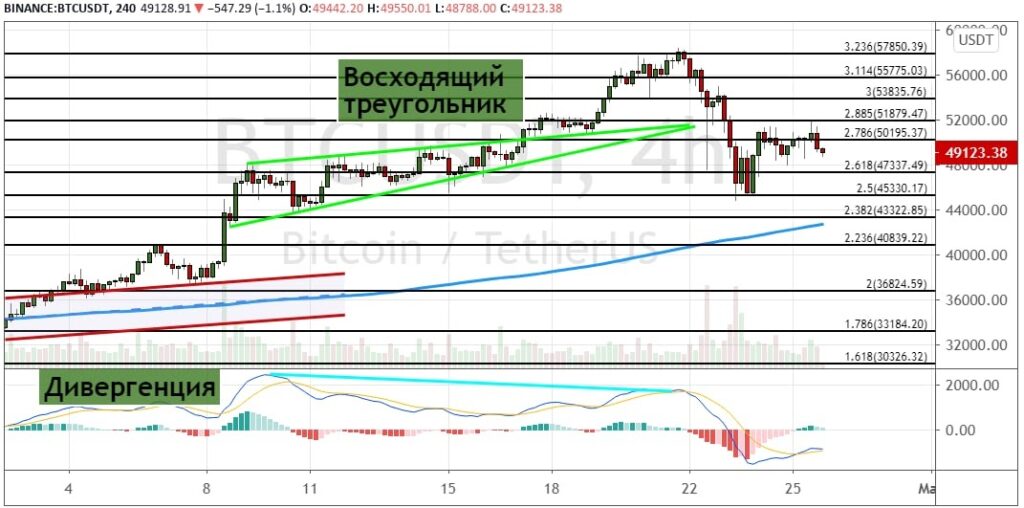 Но в краткосрочной перспективе приоритетным сценарием выступает развитие медвежьего движения ниже линии поддержки $47 337, на что указывает сохраняющая актуальность дивергенция между ценой на графике и осцилляторе MACD. Сохранение импульса на продажу приведет к падению стоимости биткоина до уровней $45 330 и $43 320 (50% и 38.2% расширения по уровням пропорции Фибоначчи), где также проходит линия 200-дневной простой скользящей средней (SMA).