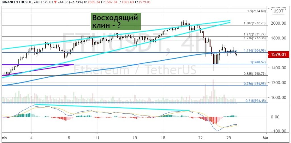 Эфир после выхода за рамки модели теханализа «Восходящий клин» начал уверенное снижение, что позволило медведям пробить поддержку на уровне $1 600 (11.4% расширение по уровням пропорции Фибоначчи), где также расположена линия 200-дневной SMA. В результате котировки ETH могут провести ретест границ области $1 400–$1 450.