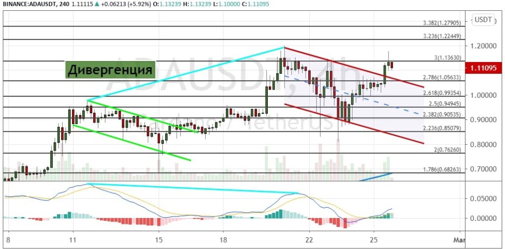 Котировки ADA отыграли сигнал в виде медвежьей дивергенции между ценой на графике и MACD, что позволило стоимости альткоина устремиться к поддержкам на уровнях $0.85, $0.90 и $0.95. Однако в этот раз быки оказались сильнее.
