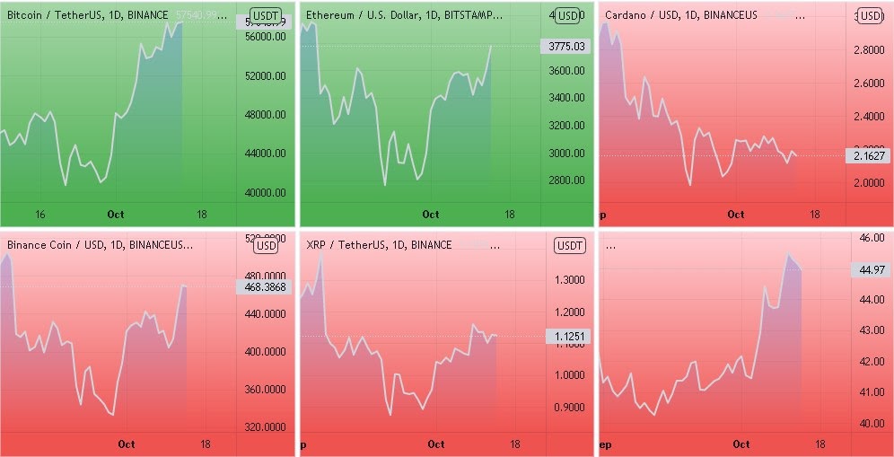 Динамика котировок BTC, ETH, ADA, BNB, XRP (дневной таймфрейм) и график доминации биткоина. Источник