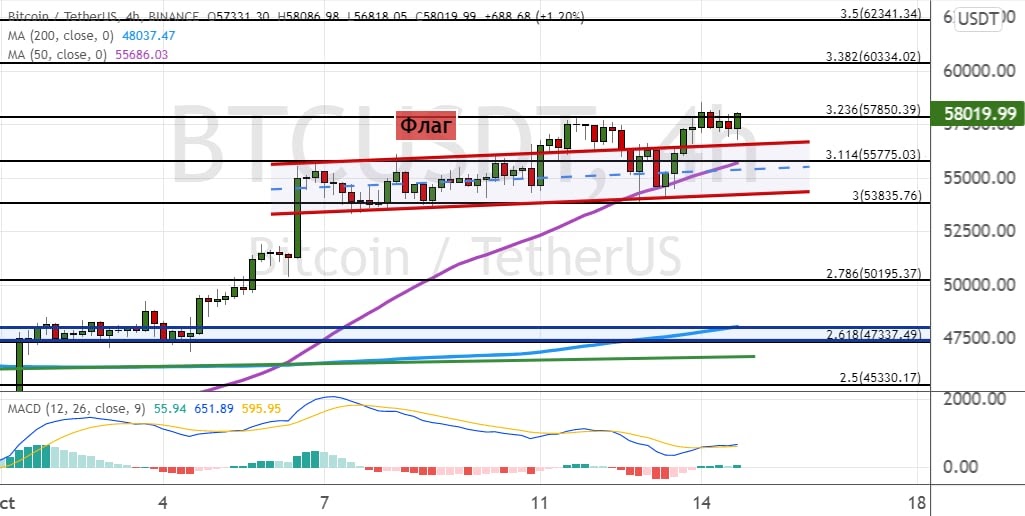 Котировки BTC поднялись выше верхней границы модели теханализа «Флаг» (показана на графике ниже красным цветом), что привело к росту до уровня $57 900. Следующая важная цель для быков находится на уровне $60 300. Сохранение импульса позволит первой криптовалюте в краткосрочной перспективе устремиться к сопротивлениям $62 340, $64 400 и $67 200.